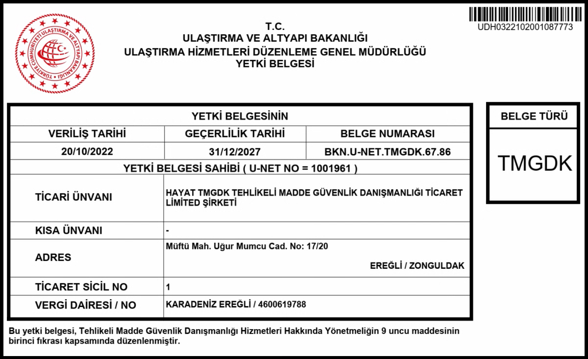 2017 yılından bu yana tehlikeli madde güvenlik danışmanlığı alanında hizmet veren HAYAT TMGDK, uzman kadrosu ve sektörel tecrübesiyle, tehlikeli maddelerin taşınmasına ilişkin bütün süreçlerin ulusal ve uluslararası mevzuatlara uygun şekilde, güvenli ve kontrollü bir biçimde yürütülmesini sağlamaktadır.