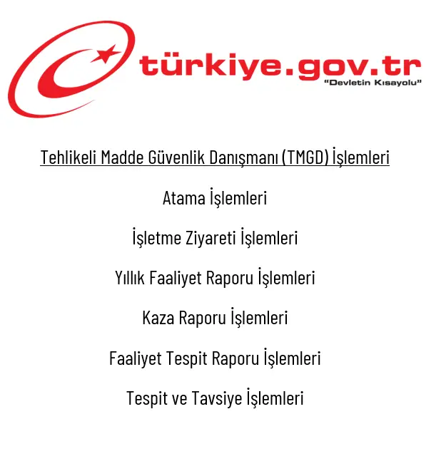 İşletmeler TMGD hizmeti almak için e-Devlet sistemi üzerinden TMGD ataması yaparak sahip oldukları tehlikeli madde faaliyet belgesini ataması yapılacak TMGD ile ilişkilendirmelidir.
